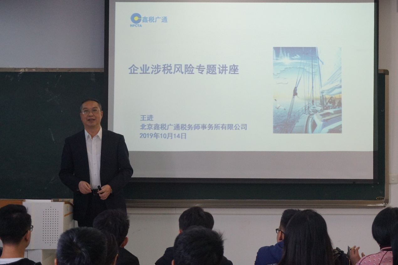 邀请,北京鑫税广通税务师事务所有限公司董事长王进在北三教A405作题为“企业涉税风险”的专题讲座,学院40余名研究生参加。
