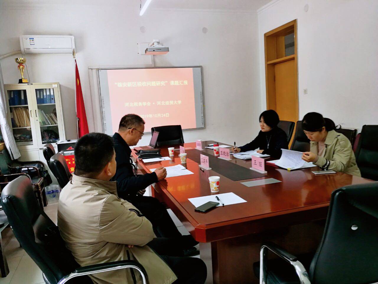 10月24日上午,中国税务学会常务副秘书长王满平、河北省税务学会秘书长王志强参加在财政税务会议室举行的“雄安新区税收政策问题研究”课题座谈会,座谈会由王晓洁院长主持,参加会议的还有王丽、宋雨薇等课题组成员。