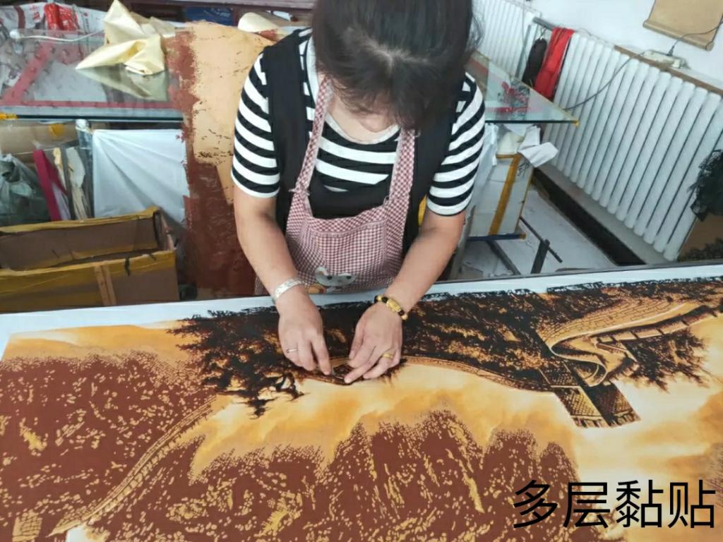 进村后通过对工作坊、厂家简单的参观,使我见识到了剪纸各个步骤以及区域划分,以及每个步骤负责的手艺人。我们蔚县人一般把剪纸称为"窗花"。蔚县剪纸以窗花见长,“天皮亮”可以说是最早的窗花形式,即在云母薄片上绘图着色进行装饰。早期当地还盛行供花鞋、荷包、枕头上刺绣用的“花样”。后来河北武强县的木版水印窗花传入,吸取其色彩特点,仿“天皮亮”透明效果,以刻代剪,形成蔚县剪纸的独特风格。蔚县剪纸以“阴刻”和“色彩点染”为主,故有“三分工七分染”之说。