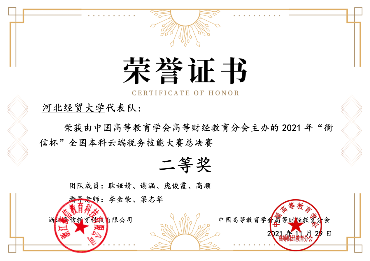 2021年“衡信杯”全国本科云端税务技能大赛通过双向技能的考核和检验,将企业的实用性税务技能用人需求、税收公务员管理能力和院校财经专业的人才培养方向相结合,能够有力的推进财税专业培养税企急需的高素质技能型人才。通过竞赛,检验了我校财政学、税收学专业税务教学成果,展现了我校学生税务岗位通用技术和职业能力,并进一步促进财税教学改革,提升人才培养工作水平。