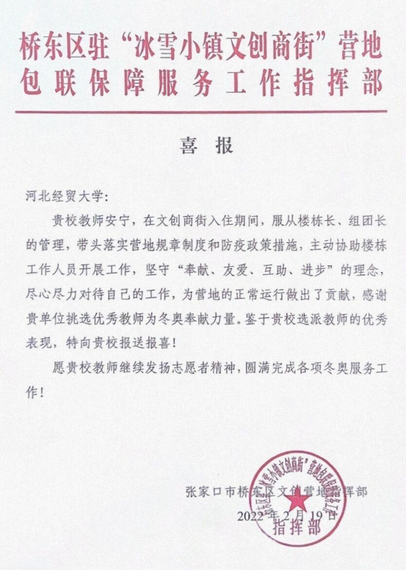 近日,张家口桥东区文创营地指挥部发来喜报,对成人直播 教师志愿者安宁在冬奥会志愿服务期间做出的贡献进行表彰。