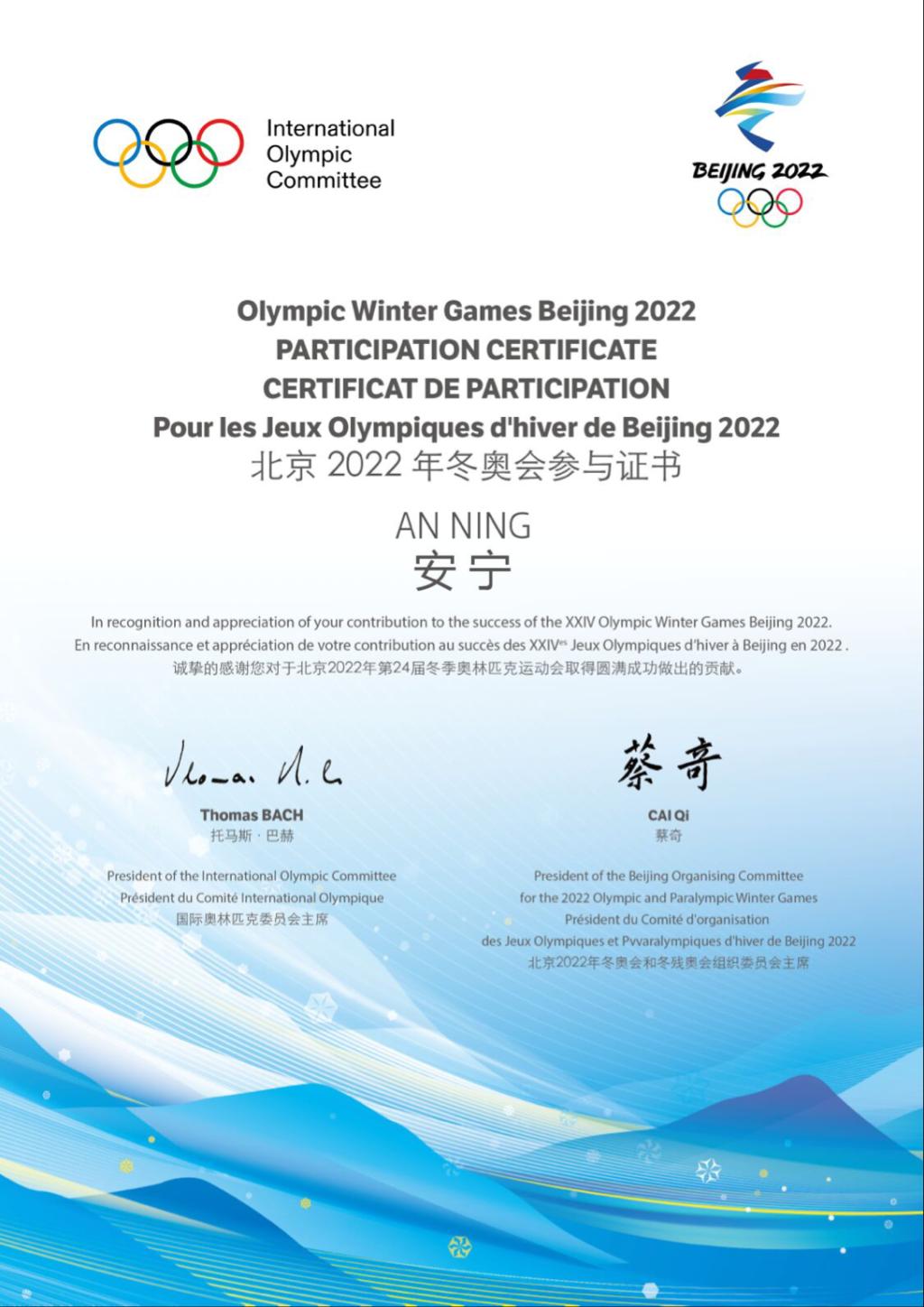 1月25日至2月20日,安宁担任北京2022年冬奥会张家口赛区国家跳台滑雪中心志愿者激励助理,带领我校34名学生志愿者在文创上街驻地开展冬奥会志愿服务。在文创商街入住期间,她带头落实营地规章制度和防疫政策措施,主动协助楼栋工作人员开展工作,表现出色,为营地的正常运行做出了贡献。