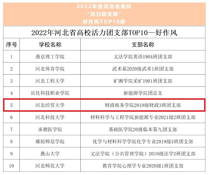2019级财政3班团支部荣登2022年度河北省高校“活力团支部”好作风榜TOP10。