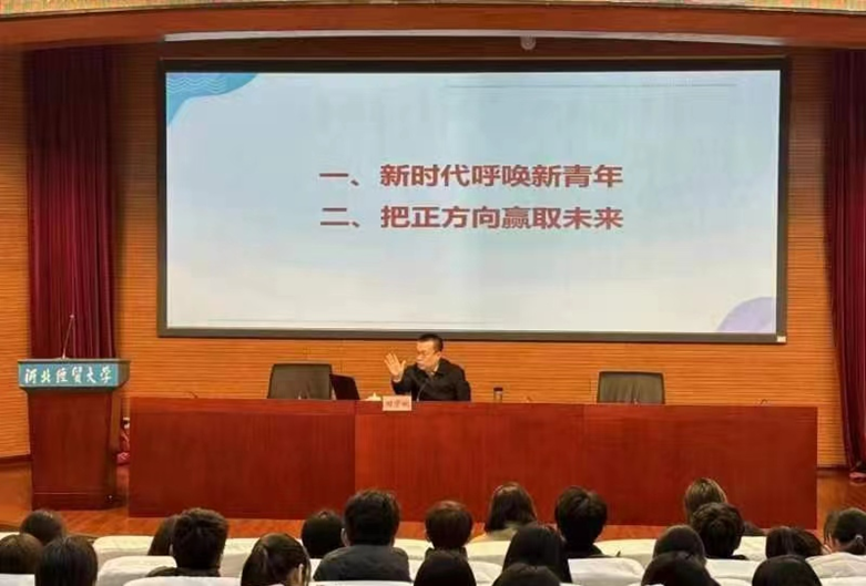 田学斌围绕“新时代呼唤新青年”和“把正方向赢未来”两个主题,结合自己的学习和工作经历,与同学们进行了分享交流。他表示,新时代是青年大有可为、大有作为的时代,思想政治教育工作要不断强化对青年的思想引领和理论武装,引导广大青年听党话、跟党走,掌握马克思主义立场、观点和方法,把广大青年培养成能够担当民族复兴重任的时代新人,做有理想、敢担当、能吃苦、肯奋斗的新时代青年。田学斌对同学们提出四点希望,一是学会做人,要提升人生价值、守正出新;二是学会学习,要多读书,学以明理、学以解惑、学以致用;三是学会规划,要明确目标、制定计划、付诸行动;四是学会研究,要敢于猜想、不断模拟、用以致学。他希望同学们勤奋学习,立志成才,通过刻苦努力,把自己培养成有志气、有底气、有勇气的大学生,不负青春,不负韶华。