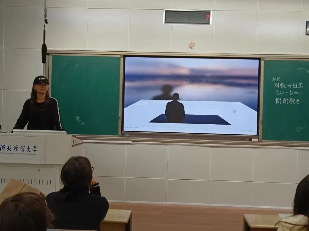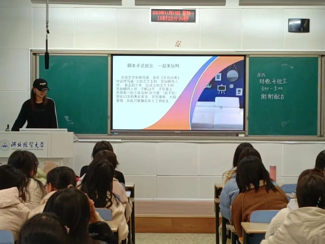 税收二班班长刘瑜萱以一场别出心裁的“剧本杀”游戏引出班会主题。通过带领同学们探索“剧本杀”主人公病症,来了解沉迷手机的危害,并反思复盘,提出了许多规避危害的可行建议。