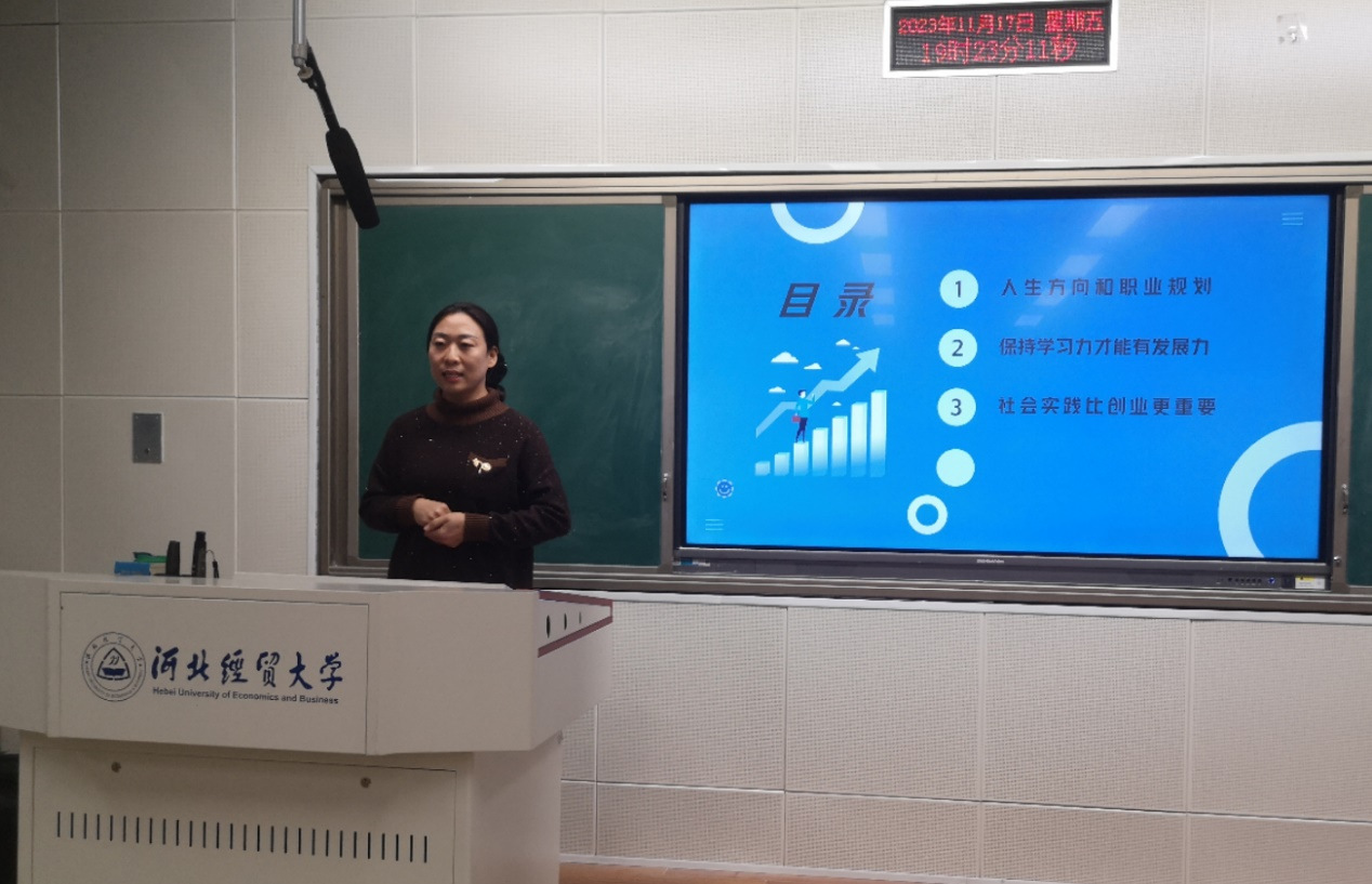 邀请萃邦商贸有限公司经理、校友尹静然在A教103作“从职场小白到小微企业负责人的心路历程”分享交流会。本次交流会党委副书记胡卓理、辅导员陈静波老师出席, 2023级同学参加。