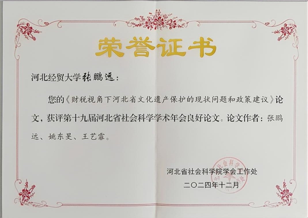 近日,成人直播 教师张鹏远与中央财经大学姚东旻、王艺霏共同撰写的《财税视角下河北省文化遗产保护的现状问题和政策建议》,获得第十九届河北省社会科学学术年会良好论文。