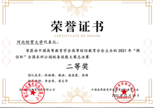 2021年“衡信杯”全国本科云端税务技能大赛通过双向技能的考核和检验,将企业的实用性税务技能用人需求、税收公务员管理能力和院校财经专业的人才培养方向相结合,能够有力的推进财税专业培养税企急需的高素质技能型人才。通过竞赛,检验了我校财政学、税收学专业税务教学成果,展现了我校学生税务岗位通用技术和职业能力,并进一步促进财税教学改革,提升人才培养工作水平。