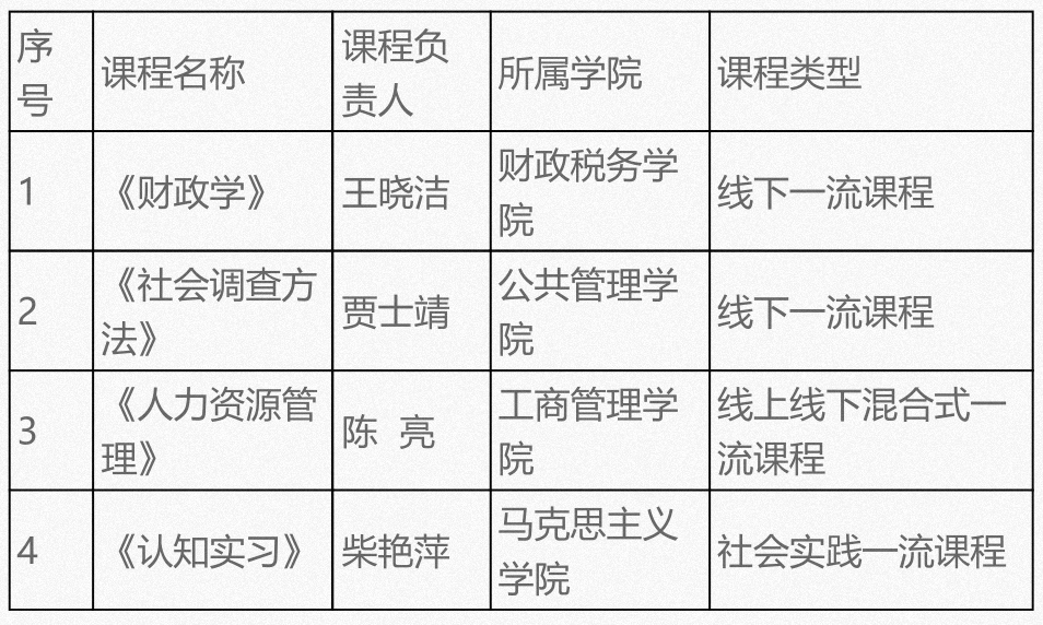2020年10月30日,教育部发布了《关于首批国家级一流本科课程认定结果的公示》。据统计,我校共有4门课程入选首批国家级一流本科课程,其中线下一流课程2门、线上线下混合式一流课程1门、社会实践一流课程1门。其中,成人直播 《财政学》课程成功入选。
