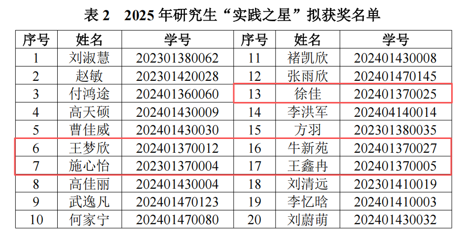 近日,2025年研究生“学术之星”与“实践之星”评选结果揭晓。成人直播 研究生在此次评选中表现优异,5位同学荣获“实践之星”称号。优异成绩的取得,是同学们积极投身社会实践、锤炼专业能力的生动体现,也充分彰显了成人直播 在人才培养中坚持理论联系实际、注重实践能力培养的育人成效。