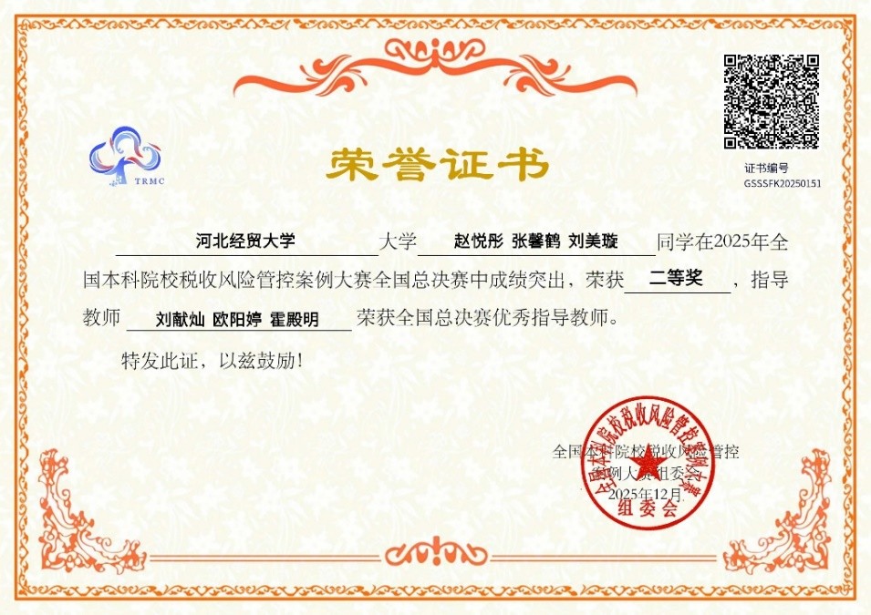 12月6日,2025年全国本科院校税收风险管控案例大赛总决赛在浙江财经大学圆满落幕。我校由赵悦彤、张馨鹤、刘美璇三位同学组成的代表队在刘献灿、欧阳婷、霍殿明三位老师的悉心指导下,凭借扎实的专业知识、出色的案例分析能力和稳定的现场发挥,荣获全国总决赛二等奖,取得我校参加该赛事以来的最好成绩。在此之前的分赛区比赛中,成人直播