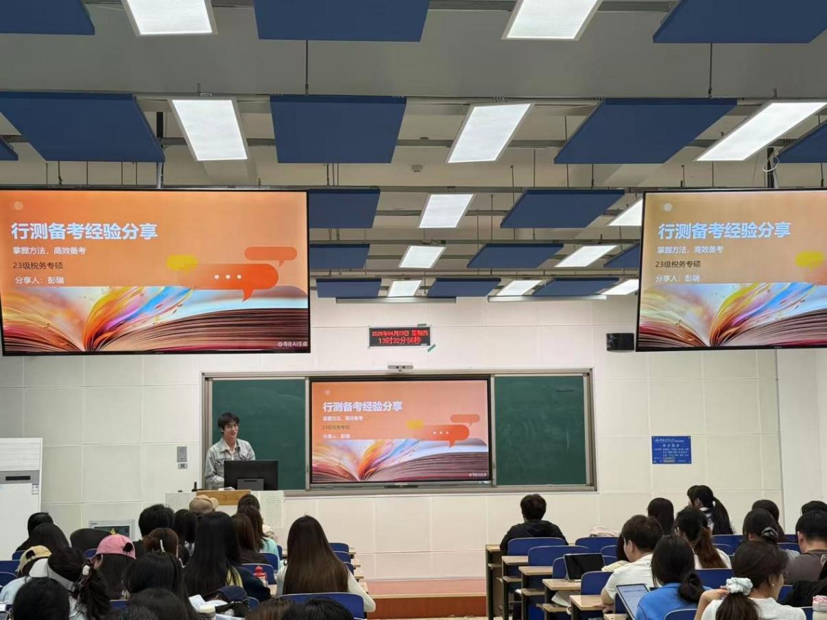 在C221教室成功举办“公务员考试备考经验交流会”。本次活动特别邀请2023级税务专硕彭瑞、苗玉欣、柴思琳、魏万斗四位已成功“上岸”的研三优秀学子到场分享备考心得。成人直播