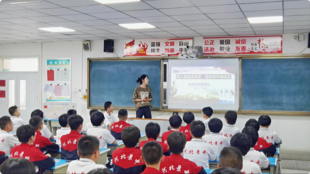 党史宣讲小队开展社会实践活动。小队成员参观革命圣地西柏坡感受革命精神,并且前往衡水市景中和大营镇中学为在校学生开展党史宣传教育。