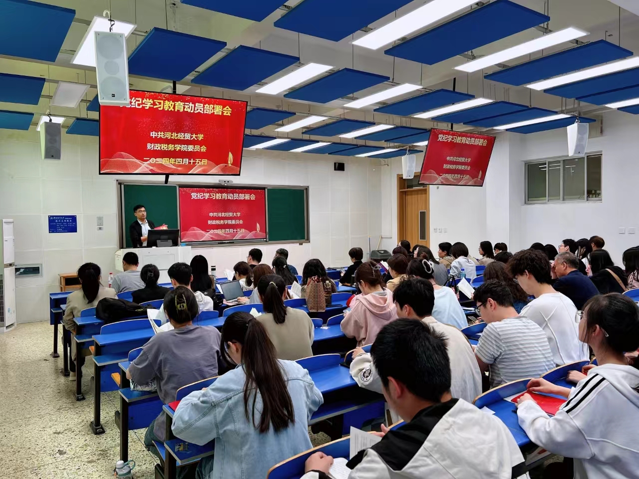 于2024年4月15日召开党纪学习教育动员部署会,院党委书记王凤飞主持会议并作启动部署,学院领导班子和全体教师、部分学生党员参会。
