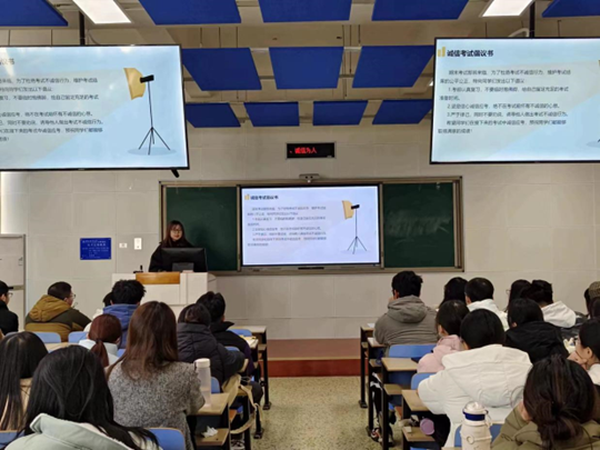 会上,学生代表向全体同学发出诚信考试倡议书,号召同学们提前准备考试复习,不要临时抱佛脚,端正考试态度,规范考试行为,不劝说、不诱导他人做出考试不诚信行为,严肃考风考纪,共同打造一个积极向上的学习氛围和良好的考试环境。翟亚宁作总结发言时,要求同学们一定要勤奋学习,诚信应考,认真备考,遵守考试纪律,在期末考试取得满意的成绩。