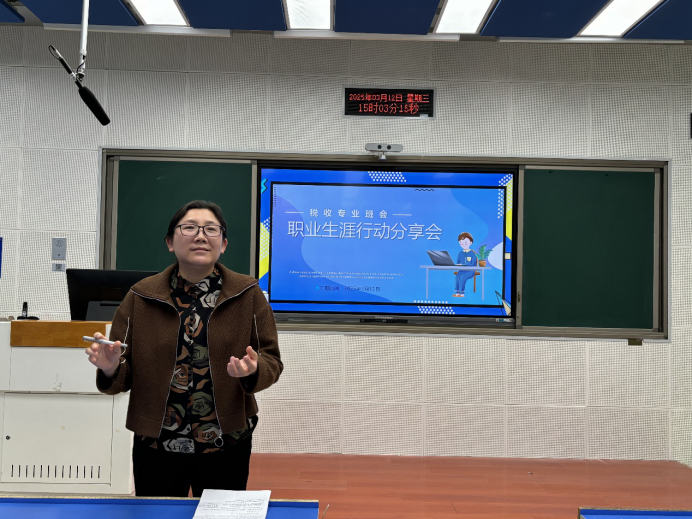 在北三教B102开展了职业生涯行动分享主题班会,郑颖出席并主持了本次分享会,2023级税收专业全体学生参加。